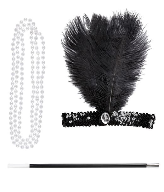 Smart set med vitt pärlhalsband, cigarettpipa och paljettpannband med fjädrar för 20-tals Flapper utklädnad