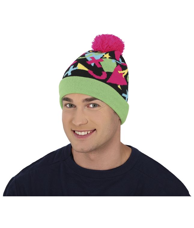 Gör en färgstark tillbakablick till 80-talet med den här coola stickade mössan! Det limegröna brättet i kombination med en svart bas och neonfärgade mönster ger en äkta retrolook, perfekt för 80-tals- och 90-talsfester, utklädnad eller bara för skojs skull.