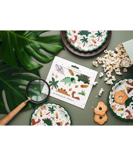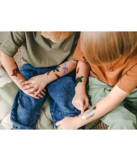 Tatueringsark med dinosaurier i blandade mönster och färger. Arket mäter 14 x 19 cm och innehåller 13 olika tillfälliga tatueringar med metallic-effekt.