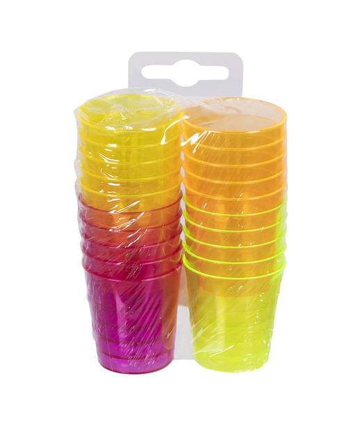 20 olika shotglas i neonrosa, gult, orange och grönt.