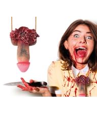 Blodig söndertrasad latex snopp på ett snöre.