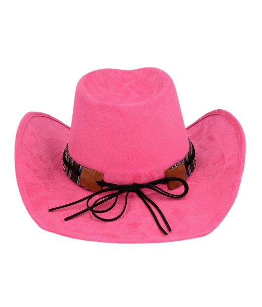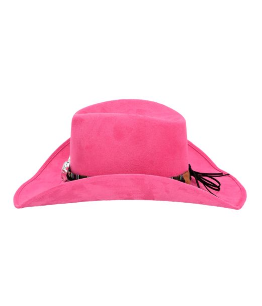 Rosa cowboyhatt i läderlook med band och kohuvud.