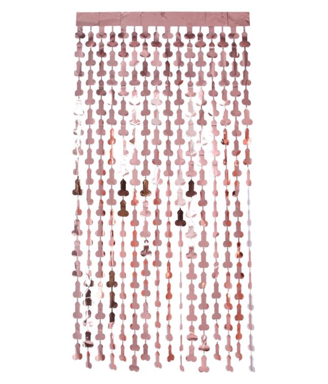 Foliegardin med penisformad glänsande folie, perfekt som dekorativ bakgrund för möhippor och evenemang. Gardinen hängs enkelt upp i överkanten och består av flera vertikala snören med hängande figurer.