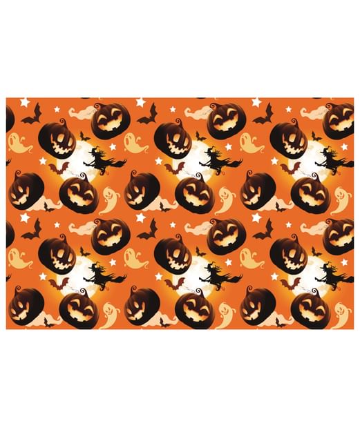 Skapa den perfekta Halloween-stämningen med den här orangefärgade bordsduken dekorerad med pumpor, häxor och spöken. Den stora duken är idealisk för festbordet och ger en praktisk och läskig dukning.