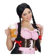 Lång svart peruk med flätor och rosetter till Heidi kostymen.