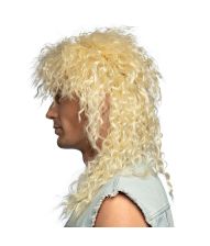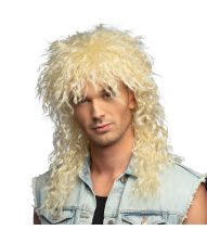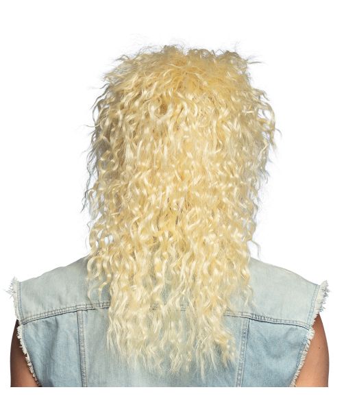 Skapa en vild rocklook med denna långa blonda peruk i lockig mullet-stil. Stram lugg och lösa, vilda lockar ger en outtröttlig rocknroll-look som fulländar en iögonfallande maskeraddräkt.
