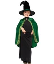Professor Minerva McGonagall maskeraddräkt med svart långklänning, grön cape och häxhatt.