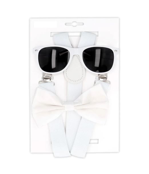 Vitt tillbehörsset med solglasögon, fluga och justerbara hängslen.