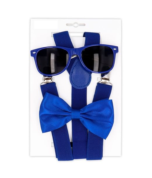 Blått tillbehörsset med solglasögon, fluga och justerbara hängslen.