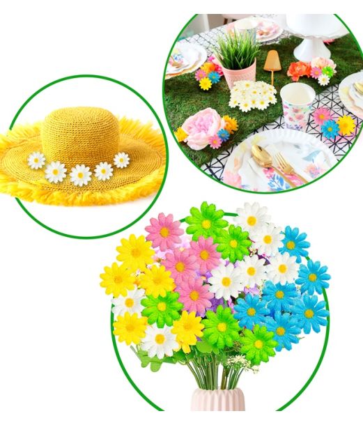 Set med 20 dekorativa tygblommor med en tydlig gul mitt. Varje blomma har flera kronblad och en platt design, lämplig att fästa på hattar, maskeraddräkter eller som borddekoration.