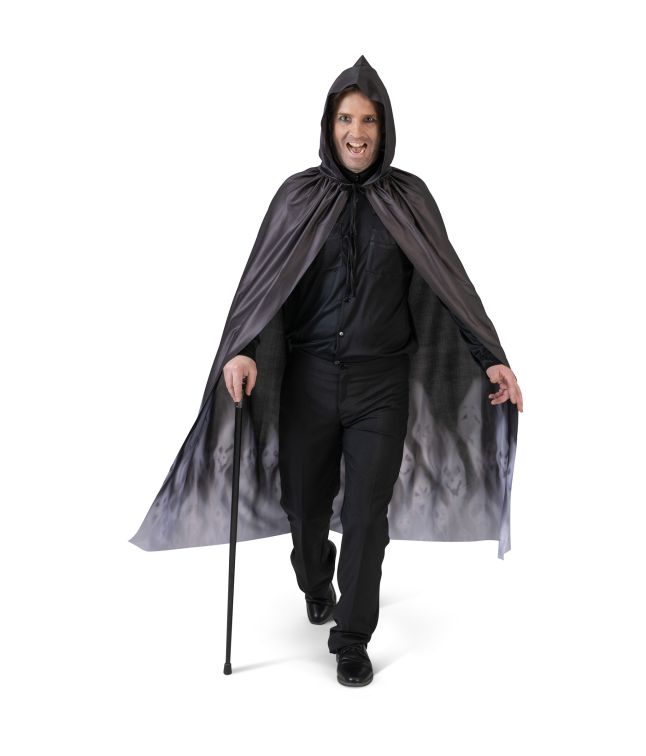 Svart cape med huva och dramatiskt lost souls-motiv längs nederkanten. Capen ger en spöklik och stämningsfull look för Halloween och temafester.