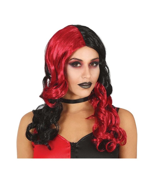 Långhårig röd och svart peruk med lockar för t.ex. harlekindräkter.