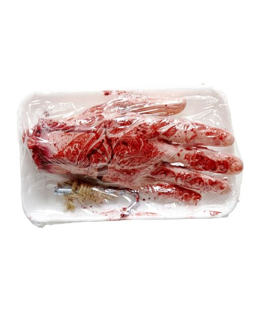 Blodig hand i en köttbricka för Halloween-dekoration eller som bordsdekoration.