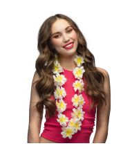 Vacker Hawaiikrans med vita och gula hibiskusblommor.