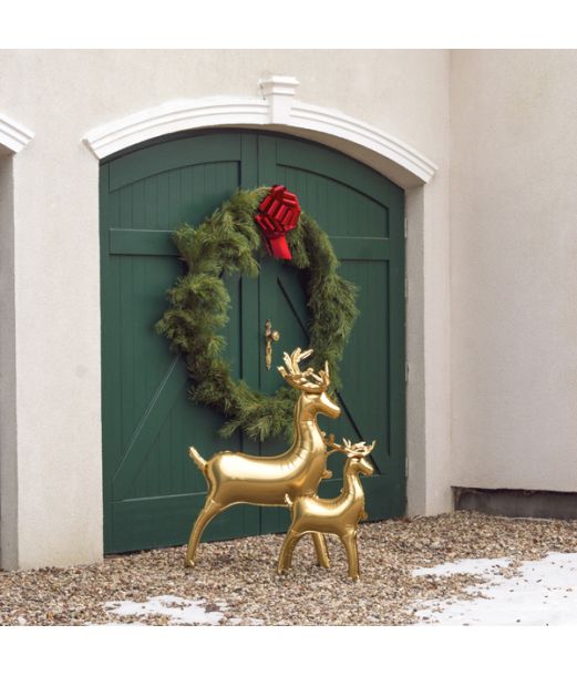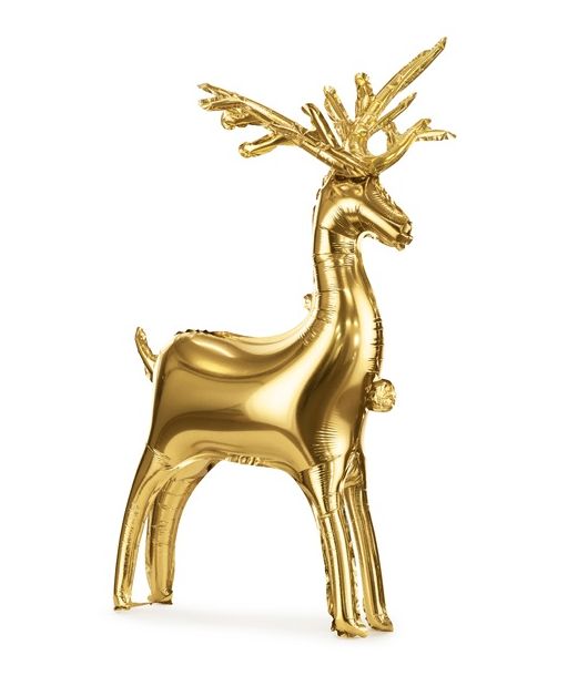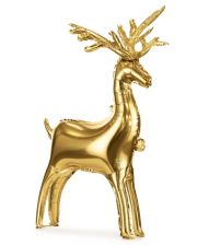Folieballong med ren i guld, perfekt till jul- eller sagotema. Den stående folieballongen blåses upp med luft med hjälp av det medföljande sugröret.