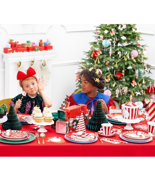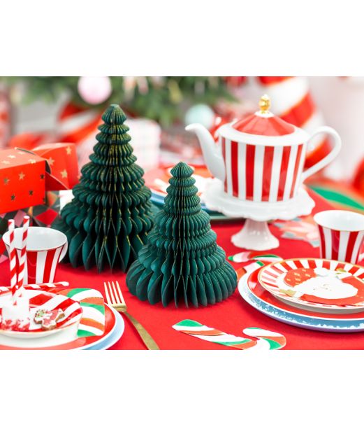 Julgran med honeycomb-struktur i djupt flaskgrönt med guldglitter på kanterna. Tillverkad av papper med ett upphängningssnöre som gör att den kan hänga eller stå som dekoration.