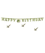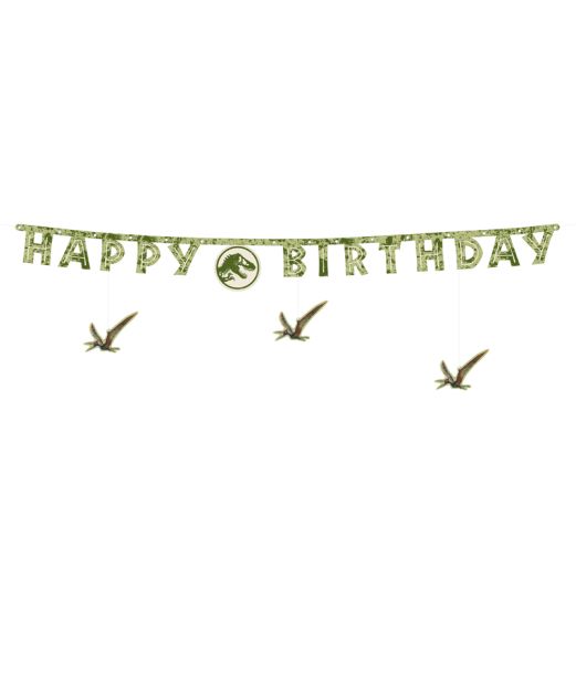 Jurassic World pappersbanner med texten "Happy Birthday" i blandade färger och dinosauriemotiv. Bannern mäter ca 165 x 45 cm totalt, bokstäverna är ca 11,5 cm höga. Levereras som DIY-kit med bokstäver, snöre och 13 nitar för montering.