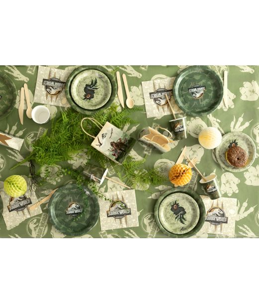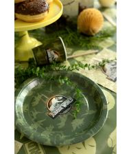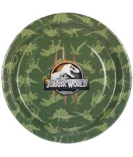Jurassic World plate 23 cm, rund tallrik i papper med ikonisk Jurassic World-logotyp och dinosauriemotiv. Perfekt för temadukningar och kalas med dinosaurietema.