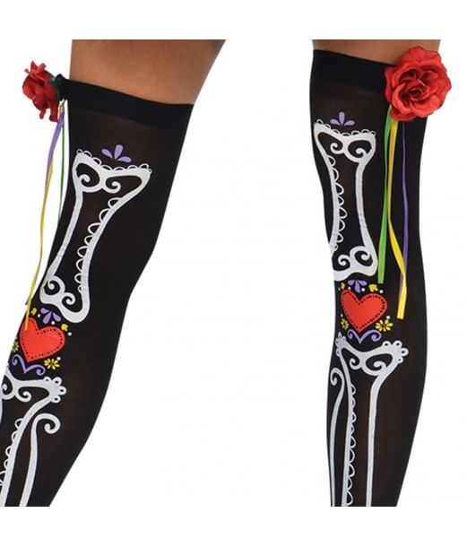 De Dödas Dag Senorita Skelett. Maskeraddräkt med klänning i ljusa färger, hårband med slöja, spetshalsband, lösa ärmar och strumpor med benmönster.