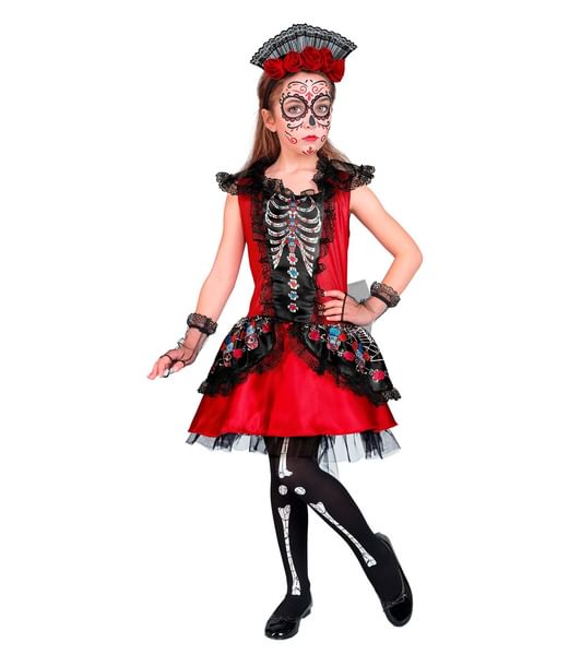 Day of the Dead maskeraddräkt med klänning med fina detaljer, fingerlösa handskar och hårband.