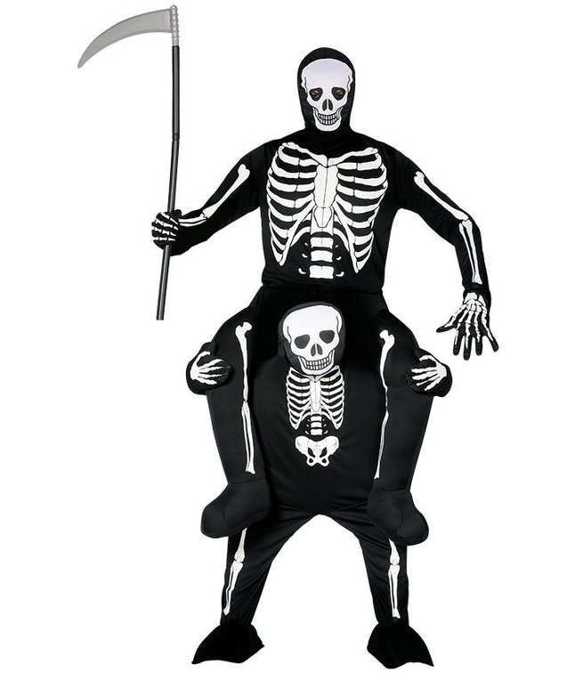 Rolig men läskig maskeraddräkt där det ser ut som att du rider på ryggen av ett annat skelett.