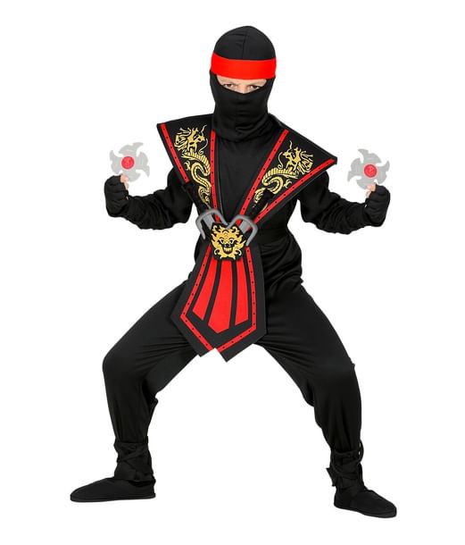 Maskeraddräkt med jumpsuit, bröstpansar, bälte, arm- och bensnören, mask, pannband, handskar, 2x ninjasai och 2x kaststjärnor.