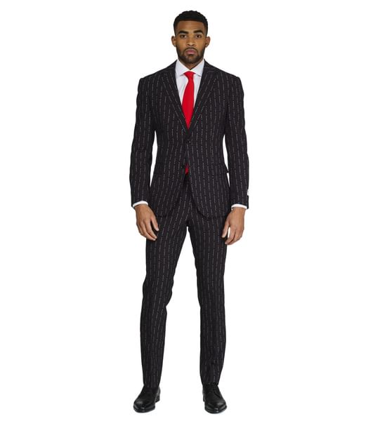 Svart julkostym från OppoSuits med vit Merry Xmas-skrift och ett roligt julmotiv på fodret. Matchande byxor och röd slips.