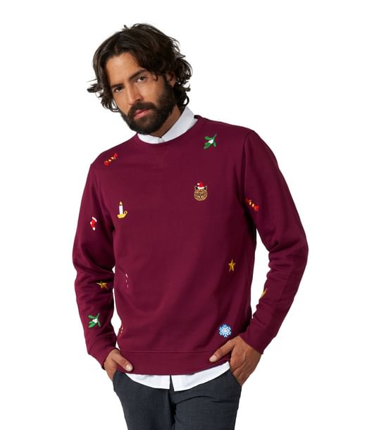 Vinröd julblus i bra kvalitet från OppoSuits med dämpade broderade julmotiv.