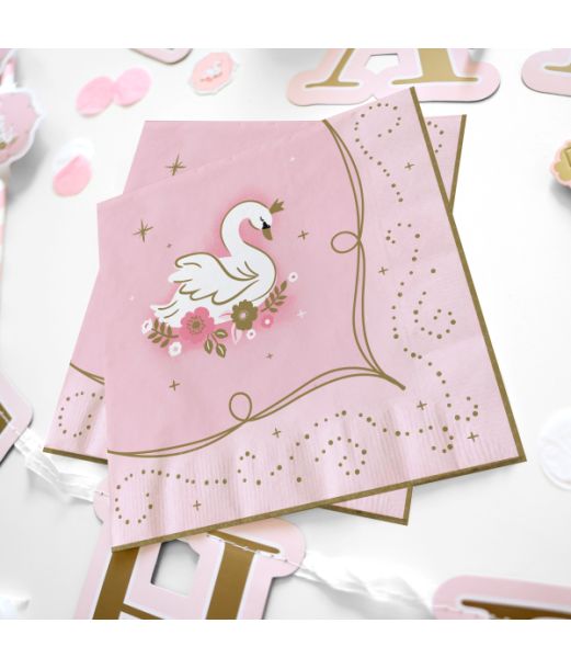 Ge din fest en elegant touch med dessa lunchservetter från Princess for a Day. Servetterna har en vacker rosa färg, pryds av en graciös svan och en dekorativ guldkant - perfekt för prinsessteman och festliga tillfällen.