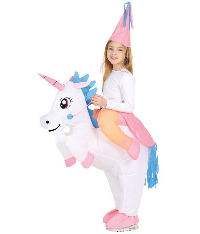 Rolig uppblåsbar enhörning med fuskben så att det ser ut som om man rider på den.