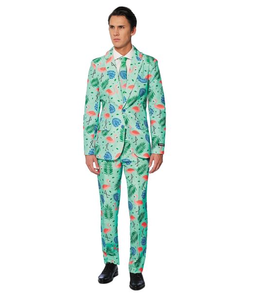 Vacker kostym i flamingos och palmblad, med kavaj, byxor och slips.