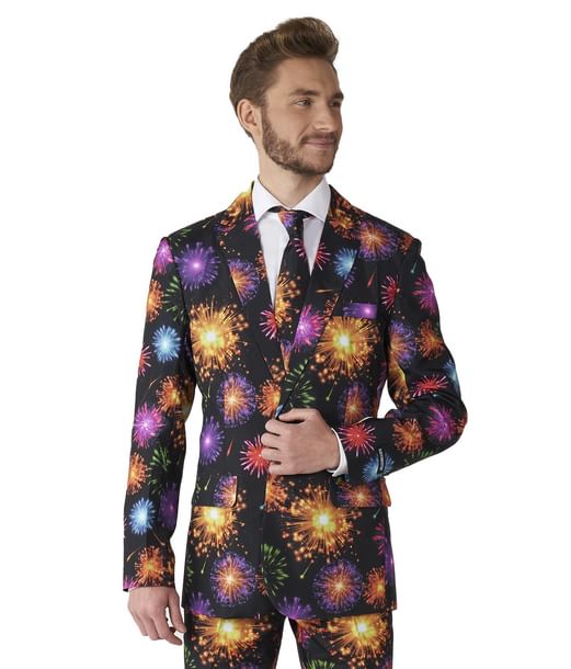 Vacker svart nyårskostym med färgglada fyrverkerier från Suitmeister.