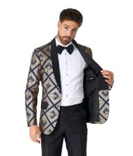 Fin Suitmeister med marinblå kavaj med guldmönster och svart kavajslag, svarta byxor och fluga.