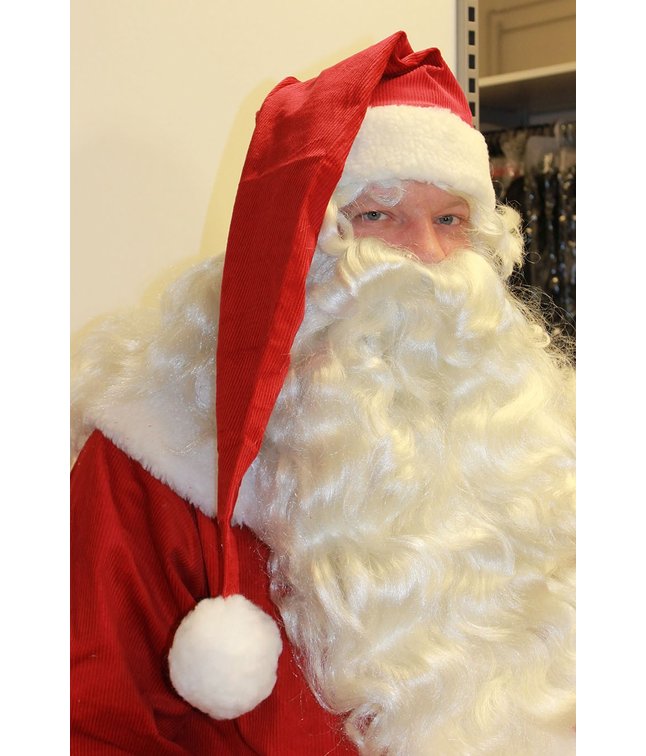 Mycket fin och lång lyxig tomteluva i vacker järnvägssammet med ett brett plyschbrätte.