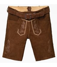 Korta bruna lederhosen i äkta läder med bälte och vackert broderi.