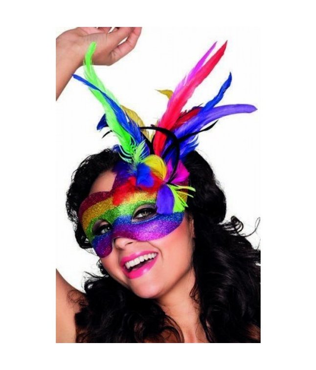 Regnbågsfärgad halvmask med fjädrar. Perfekt för Copenhagen Pride eller något annat festligt tillfälle.
