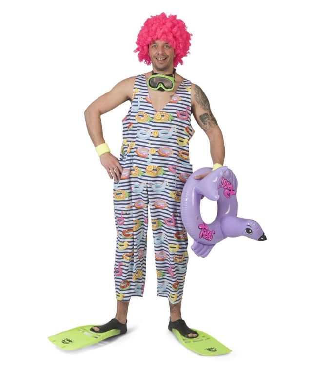 Retro baddräkt med blå och vita ränder med roliga sommarmotiv. Ärmlös modell med djup V-ringning och knälånga ben för en avslappnad look på stranden eller på temafesten.